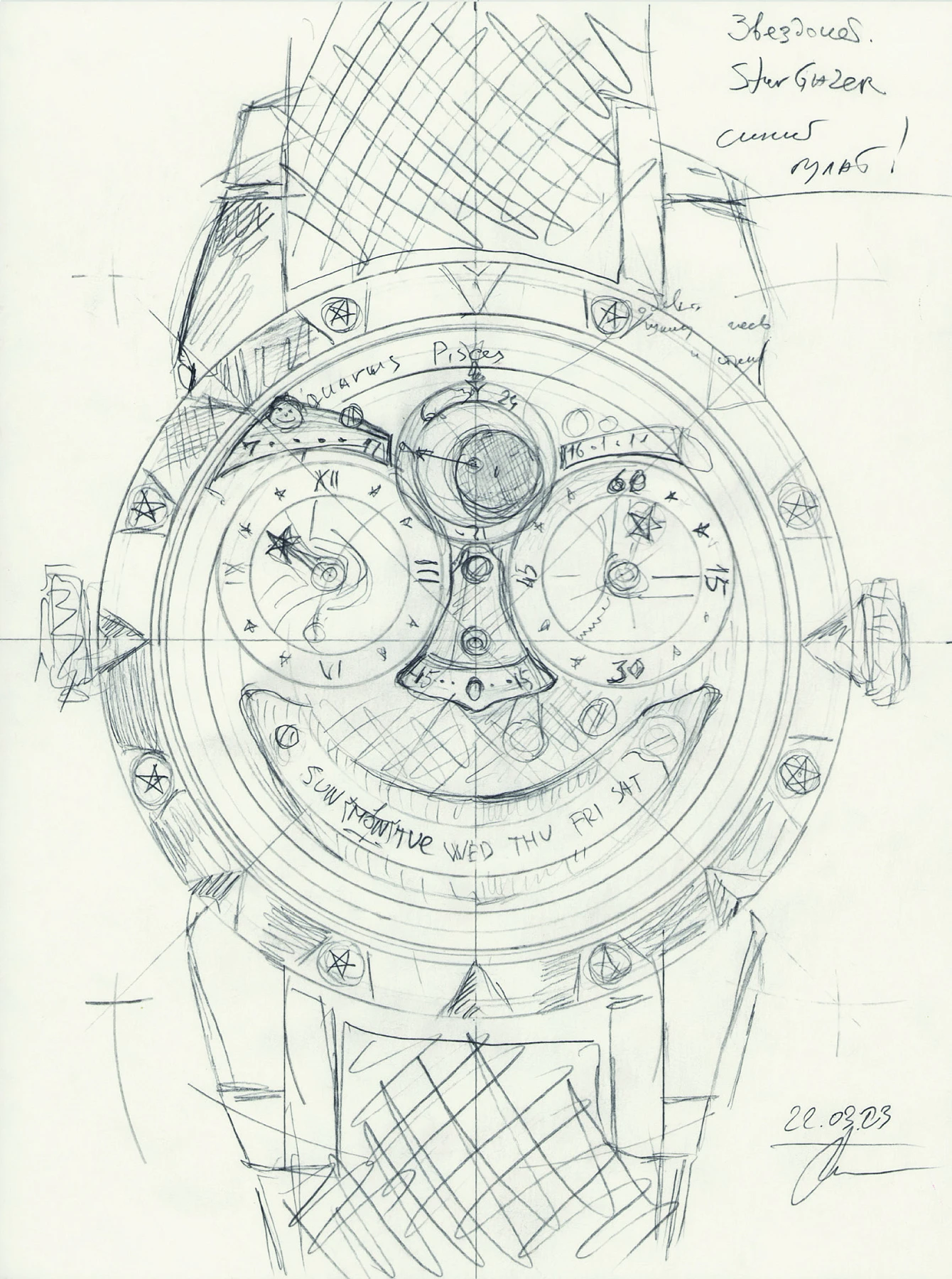 Уже на этом эскизе, нарисованном 22 марта 2023 года, присутствуют все основные признаки часов «Звездочёт»: все указатели этой стороны сверхсложного механизма; двойные ушки крепления ремешка, благодаря которым эти часы можно носить любой из сторон вверх; звёзды, использованные в декоре ободка и циферблата. Также Константин Чайкин отметил, что часы будут произведены из булата.